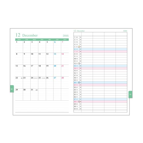 マンスリーを見ながら、4項目の予定を同時に管理できるダイアリーです。左ページは予定を把握しやすい月間ブロックで、右ページは家族の予定・家計簿などに最適な4項目リストになっています。表紙の透明窓から見えるカラフルなインデックスが特徴です。【検索ハッシュタグ】#日付品#26日付#ダイアリー#レイメイ藤井