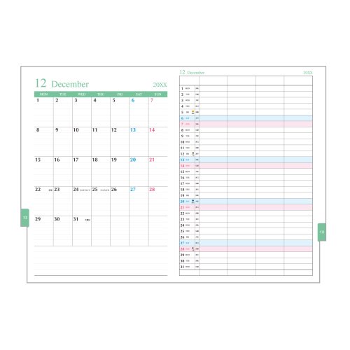 マンスリーを見ながら、4項目の予定を同時に管理できるダイアリーです。左ページは予定を把握しやすい月間ブロックで、右ページは家族の予定・家計簿などに最適な4項目リストになっています。表紙の透明窓から見えるカラフルなインデックスが特徴です。【検索ハッシュタグ】#日付品#26日付#ダイアリー#レイメイ藤井