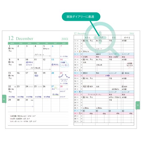 マンスリーを見ながら、4項目の予定を同時に管理できるダイアリーです。左ページは予定を把握しやすい月間ブロックで、右ページは家族の予定・家計簿などに最適な4項目リストになっています。表紙の透明窓から見えるカラフルなインデックスが特徴です。【検索ハッシュタグ】#日付品#26日付#ダイアリー#レイメイ藤井