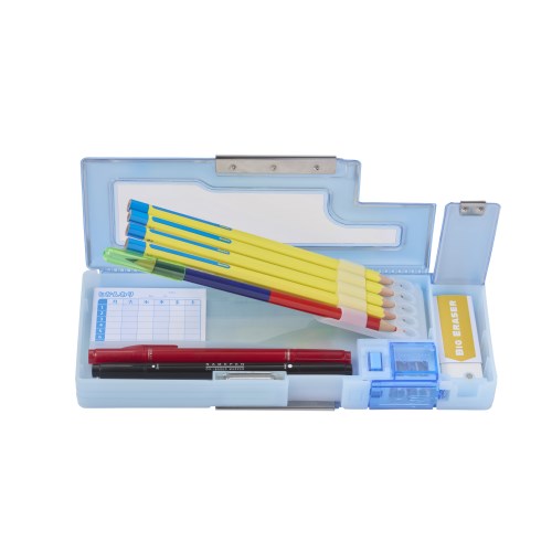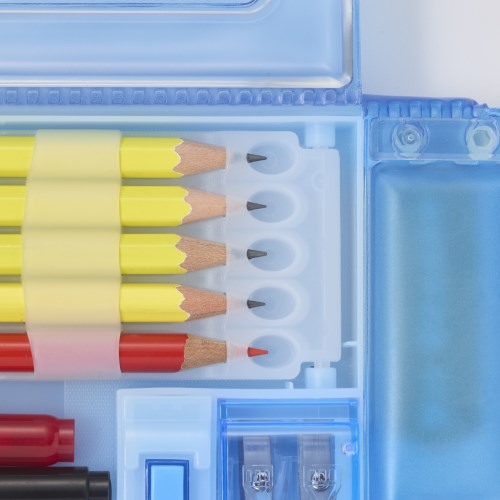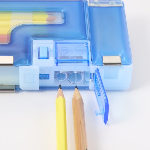 収納力の高い神収納な箱型ペンケースです。鉛筆以外に名前ペンとカラーペンなど2本のペンが入るペンスペースがあります。内蔵の削り器は太軸でも削れ、消しゴムポケットは大きな消しゴムでも収納可能です。