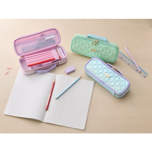 大容量だけどスタイリッシュなペンケースです。キルティングデザインとロゴ入りチャームに加えて、取っ手のハートデザインが可愛いのが特徴です。コンパスが箱ごと入る大容量になっています。太軸鉛筆でもペンホルダーに差し込め、ペンホルダーは取り外し可能なので塾でのご使用時にボールペンやシャープペンを収納することもできます。