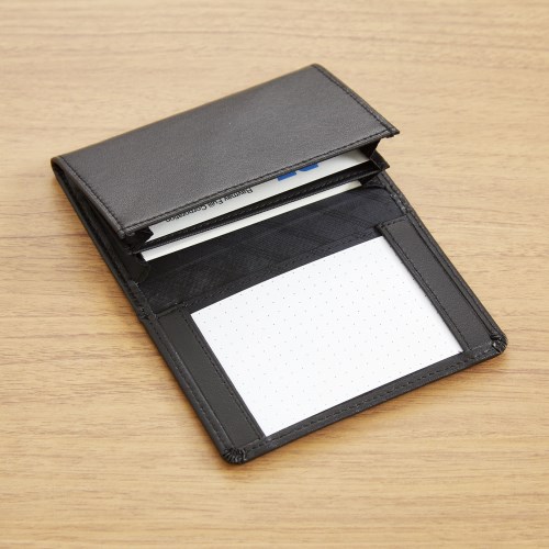 ビジネスシーンに最適なメモホルダー付の便利な名刺入です。メモも名刺もひとまとめで、ささっと書いてスマートに渡せるメモホルダー付です。中には仕切りがあり、名刺30枚程が収納可能です。