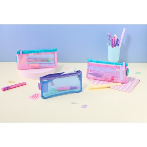 メッシュタイプの可愛いカラーのペンケースです。内側にゴムバンドの仕切りが4つ付いているため、大きさの異なる小物を分けて収納できます。メモ帳も入るサイズなのでメモが必要な時でもすぐにご使用できます。