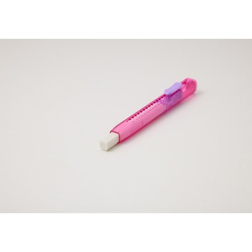 スマートにしまえるペンタイプの消しゴムです。ボディがクリアなのでレトロ感が出てかわいいのが特徴です。スライド部位が湾曲していて指にフィットするため上下しやすくなっています。