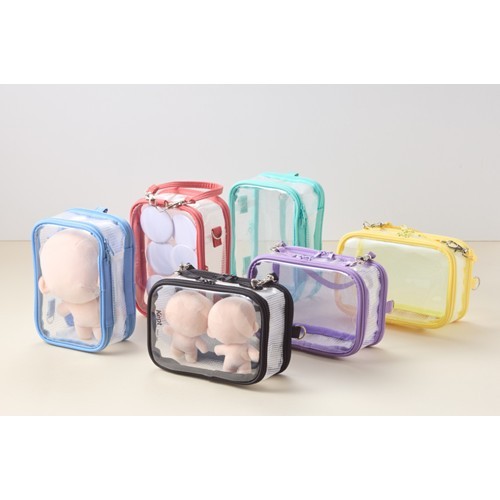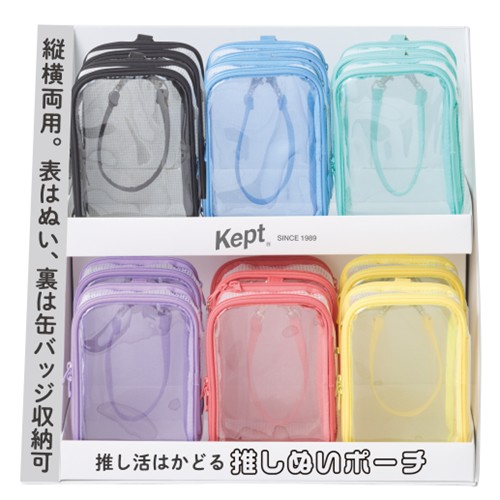 Keptのぬいぐるみポーチです。表面にはぬいぐるみが収納でき、裏面には缶バッチが付けられます。持ち手は縦横両用なのでぬいぐるみに合わせて調整できます。大きいぬいぐるみから小さいぬいぐるみまで収納できて、缶バッチも付けられるのでライブグッズの収納に最適です。鑑賞用ケースや持ち運び用ケースとして色々ご使用いただけます。