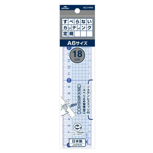 カッターでの作業時にも使えるすべらないカッティング定規です。定規の端にステンレス製の金棒をはめ込んでいるのでカッターでの作業時にも定規を傷つけることなくまっすぐカットできます。裏面にはスベリ止め特殊加工が施されていることでスライドのしやすさと滑りずらさという反対の機能を実現しました。定規で測る際には軽い力でスライドでき、カッターでカットする際に強く力をかけて抑えると動かなくなります。5cmごとに色塗りがされていることに加えて、目盛に矢印の記載があるので測る時に見やすくなっています。