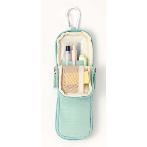 カラビナ付きの面白いコンパクトペンケースです。ファスナーを半分まで開けると外側に折りたためることができ、カラビナでバッグに取り付けた状態で簡単にペンを取り出せます。折りたたんだ部位はマグネットで固定させているので取り出しやすく便利な仕様です。全体を開くと内側にメッシュポケットがあり、小物を収納できます。ペンのホルダーはゴムバンドになっているので太い物から細いものまで収納できます。カバンの外側に付けても便利ですが、作業が多い方はズボンのベルトループに付けるとペン型ハサミなどを収納すれば作業用みにポーチにもなります。