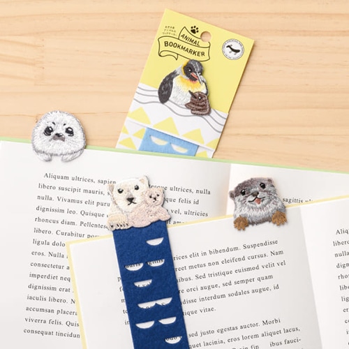動物たちが本のページからのぞき見ているかわいいしおりです。動物園で人気のある動物たちの特徴のある毛並みや質感を、繊細な刺繍で丁寧に表現しました
