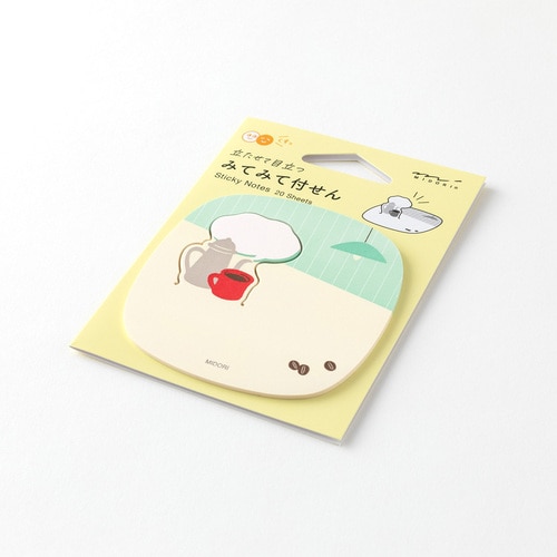 モチーフ部分(付せんの抜き部分)を立ち上げて、デスクの上などで目立たせられる付せんです。 ほっこりとしたストーリーを感じるデザインにしているので、受け取った方にメッセージと一緒に、心が緩むような時間を届けることができます。暮らしの中でのちょっとしたコミュニケーションにぴったりです。 「コーヒー柄」 落ち着いた雰囲気のコーヒータイムのデザイン。相手にちょっと一息入れて欲しいときのメッセージにもぴったりです。 湯気の部分に、相手の名前やちょっとした一言が書けます。