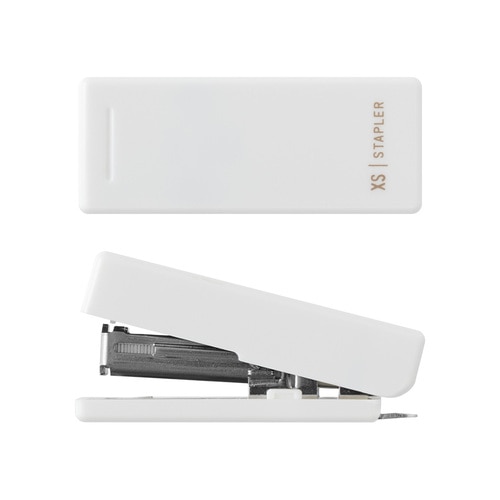従来の『XSコンパクトホッチキス』をさらに小さくリニューアルしました。全長48.2mm、幅19.7mm、奥行き13.6mmと、約30%の小型化を実現し、より携帯性を高めました。折り畳めてコンパクトに収納できる/針外しに便利なリムーバー付き/針の位置を確認できる目印付き/コピー用紙を10枚まで留められるなど、小さいながらも従来の製品と同じ機能を持ち合わせています。白・黒・えんじ・紺の4色の展開です。【検索ハッシュタグ】#ミドリ#XS#XSシリーズ#コンパクト#事務用品#ホッチキス
