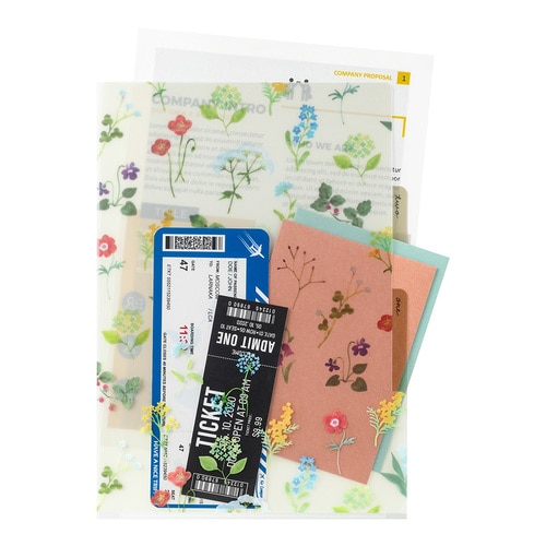 右端が大きく開き、書類の出し入れがスムーズな3ポケット仕様のクリアホルダー。 用途に合わせて書類をざっくり仕分けができます。ポケットごとに絵柄が異なり、書類をいれる位置によってデザインの変化が楽しめます。また、各ポケットにインデックスがついているので、用途ごとに分類したり、書類を探したりする際にも目印になります。 誰でも楽しく分類上手になれる仕様です。 書類の分類に最適なA4サイズは、仕事、家庭、勉強と、さまざまなシーンで活躍します。 ※再生材料を50%使用した素材を使用しています。 色とりどりの花を、水彩タッチのナチュラルな雰囲気で仕上げたデザインです。【検索ハッシュタグ】#3ポケットクリアホルダー#A4#花柄#植物柄