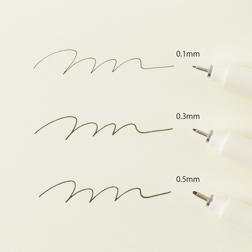 水性顔料インクを使った、耐水性のあるミリペンが『MDノート』にぴったりの筆記具として仲間入りしました。 普段使いにちょうどいい3種類の線幅をそろえていて、書く表現の幅もぐっと広がります。 ペンの太さは、軸に描かれた「実線」でひと目でわかるデザインに。 机の上に置いたままでも、感覚的に使いたい太さが選べます。 軸の樹脂色は、『MDノート』に似合うクリーム色。 紙の色合いにやさしく溶け込み、ノートと並べたときに自然な統一感が生まれます。 ・0.1mm:細かな文字や精密な描画に最適。緻密な表現や細部の書き込みに活躍します。【検索ハッシュタグ】#デザインフィル#designphil#midori#かわいい#おしゃれ#おすすめ#シンプル#大人#記録#ライフログ#日記#手帳#デコ#学生#趣味#無垢#ナチュラル#黒#ブラック#ペン#水性ペン#ミリペン