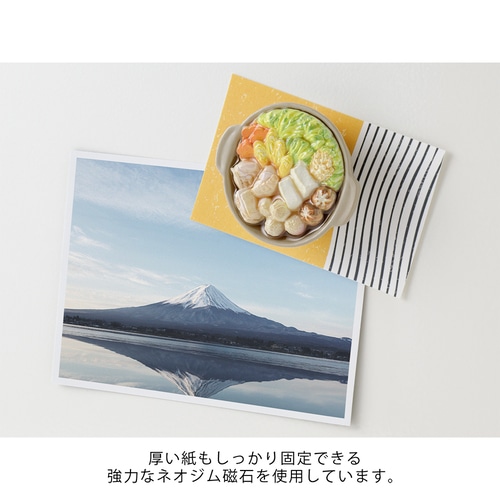 日本の料理や飲み物をミニチュアサイズで再現した強力なマグネットです。 複雑な形状も表現できるレジンを使った成型に、再現性の高いインクジェット印刷、さらに細かな部分には手塗りを用い、各モチーフの形状や色、ツヤなど細部にまでこだわっています。いずれの柄も、食欲をそそるしずる感のある見た目に仕上げました。 強力で滑り止めが付いており、コピー用紙5枚をしっかり止められます。また、厚い紙もしっかり固定できる強力なネオジム 磁石を使用しています。 パッケージは、絵画を飾る額縁をイメージして、一つひとつのアイテムが美しく見えることを意識して作りました。 外国人観光客へのお土産やギフトにもおすすめです。 【警告】 ●この製品はおもちゃではありません。 ●6才未満のお子さまには絶対に与えないでください。また、手の届かない所に保管してください。誤飲した場合はすぐに医師の診断を受けてください。 【ご使用にあたって】 ○磁石内蔵のため、携帯電話、磁気カード、医療機器、精密機器等に近づけないでください。 ○高所から落とすなど、強い衝撃を与えると破損す恐れがあります。 商品名:ミドリ マグネット マグネット 1個入 寄せ鍋柄 43436006