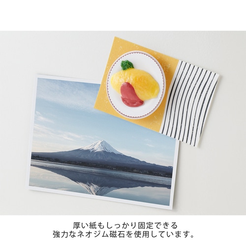 日本の料理や飲み物をミニチュアサイズで再現した強力なマグネットです。 複雑な形状も表現できるレジンを使った成型に、再現性の高いインクジェット印刷、さらに細かな部分には手塗りを用い、各モチーフの形状や色、ツヤなど細部にまでこだわっています。いずれの柄も、食欲をそそるしずる感のある見た目に仕上げました。 強力で滑り止めが付いており、コピー用紙5枚をしっかり止められます。また、厚い紙もしっかり固定できる強力なネオジム 磁石を使用しています。 パッケージは、絵画を飾る額縁をイメージして、一つひとつのアイテムが美しく見えることを意識して作りました。 外国人観光客へのお土産やギフトにもおすすめです。 【警告】 ●この製品はおもちゃではありません。 ●6才未満のお子さまには絶対に与えないでください。また、手の届かない所に保管してください。誤飲した場合はすぐに医師の診断を受けてください。 【ご使用にあたって】 ○磁石内蔵のため、携帯電話、磁気カード、医療機器、精密機器等に近づけないでください。 ○高所から落とすなど、強い衝撃を与えると破損す恐れがあります。 商品名:ミドリ マグネット マグネット 1個入 オムライス柄 43443006