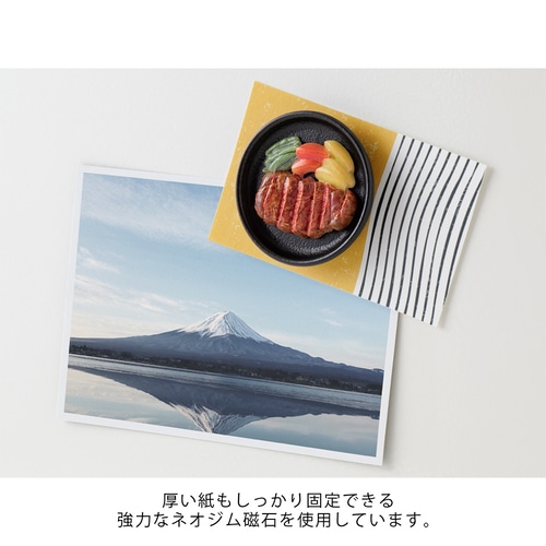日本の料理や飲み物をミニチュアサイズで再現した強力なマグネットです。 複雑な形状も表現できるレジンを使った成型に、再現性の高いインクジェット印刷、さらに細かな部分には手塗りを用い、各モチーフの形状や色、ツヤなど細部にまでこだわっています。いずれの柄も、食欲をそそるしずる感のある見た目に仕上げました。 強力で滑り止めが付いており、コピー用紙5枚をしっかり止められます。また、厚い紙もしっかり固定できる強力なネオジム 磁石を使用しています。 パッケージは、絵画を飾る額縁をイメージして、一つひとつのアイテムが美しく見えることを意識して作りました。 外国人観光客へのお土産やギフトにもおすすめです。 【警告】 ●この製品はおもちゃではありません。 ●6才未満のお子さまには絶対に与えないでください。また、手の届かない所に保管してください。誤飲した場合はすぐに医師の診断を受けてください。 【ご使用にあたって】 ○磁石内蔵のため、携帯電話、磁気カード、医療機器、精密機器等に近づけないでください。 ○高所から落とすなど、強い衝撃を与えると破損す恐れがあります。 商品名:ミドリ マグネット マグネット 1個入 ステーキ柄 43445006