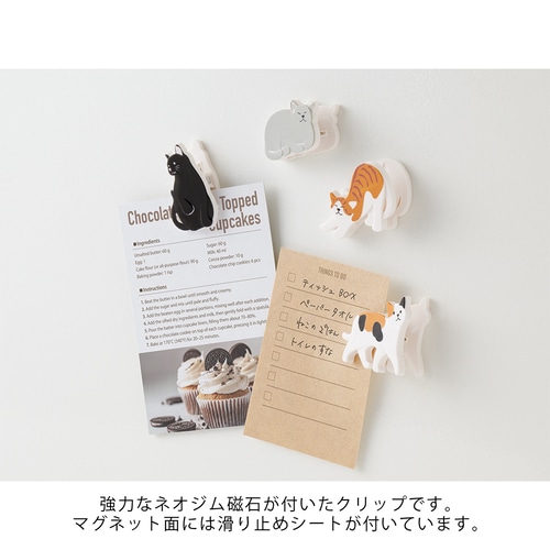 4種類のかわいい動物をアソートした、マグネット付きクリップです。 それぞれの形と仕草の特徴を捉えつつも、紙を挟んだときに動物が自然なポーズになるよう、形にこだわりました。 コピー用紙5枚を挟めるほか、裏面のマグネット部分には強力なネオジム磁石を採用し、 オフィスのホワイトボードや自宅の冷蔵庫などを彩るアイテムとして楽しくお使いいただけます。 絵画を飾る額縁をイメージしたパケージで、ギフトにもおすすめです。 ネコ柄:猫らしいかわいいポーズを再現しました。 黒猫、トラ猫、三毛猫、グレー猫。 【警告】 ●この製品はおもちゃではありません。 ●6才未満のお子さまには絶対に与えないでください。また、手の届かない所に保管してください。誤飲した場合はすぐに医師の診断を受けてください。 【ご使用にあたって】 ○磁石内蔵のため、携帯電話、磁気カード、医療機器、精密機器等に近づけないでください。 ○高所から落とすなど、強い衝撃を与えると破損す恐れがあります。 商品名:ミドリ 磁石 マグネットクリップ ネコ柄A 43447006