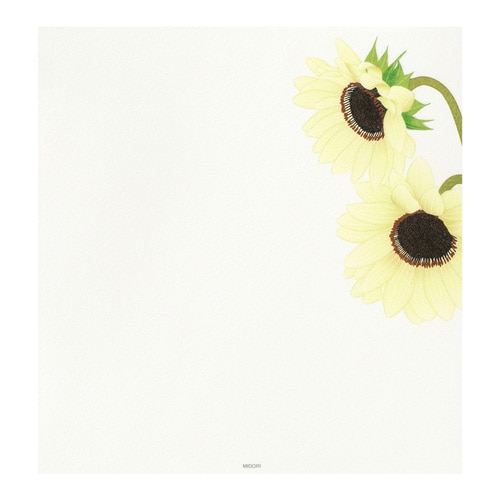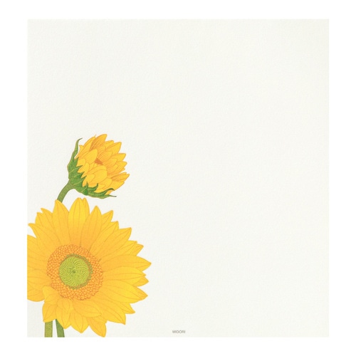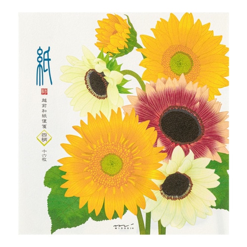 1000年もの時を重ねてきた伝統素材の和紙を用いて、四季折々の花々を大胆な構図でデザインした季節の便りです。 少ない文字数でも美しく完成される紙面デザインは「紙シリーズ」ならでは。 盛夏の鮮やかな柄をそろえました。 やさしい肌合いの越前和紙「越前鳥の子」(白)を使用しています。 夏の日差しの中、あざやかに咲く4種類のひまわりをアソート。 大きさや色など品種の異なるひまわりをアソートしました。 4柄各4枚、16枚入りです。 商品名:ミドリ 便箋 4柄入 ひまわり柄 81025006