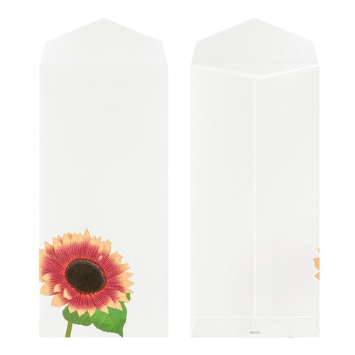1000年もの時を重ねてきた伝統素材の和紙を用いて、四季折々の花々を大胆な構図でデザインした季節の便りです。 少ない文字数でも美しく完成される紙面デザインは「紙シリーズ」ならでは。 盛夏の鮮やかな柄をそろえました。 やさしい肌合いの越前和紙「越前鳥の子」(白)を使用しています。 夏の日差しの中、あざやかに咲く4種類のひまわりをアソート。 大きさや色など品種の異なるひまわりをアソートしました。 4柄各2枚の8枚入りです。 商品名:ミドリ 封筒 4柄入 ひまわり柄 81026006