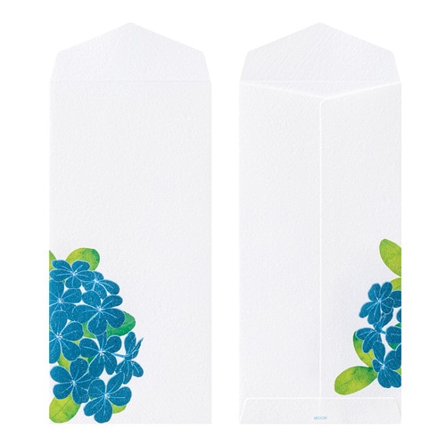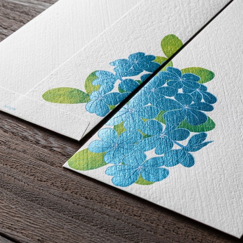 1000年もの時を重ねてきた伝統素材の和紙を用いて、四季折々の花々を大胆な構図でデザインした季節の便りです。 少ない文字数でも美しく完成される紙面デザインは「紙シリーズ」ならでは。 盛夏の鮮やかな柄をそろえました。 特有のハケ目がある風合いの良い伊予和紙(白)を使用しています。 晩夏まで長期間にわたって次々と開花するルリマツリ。涼しげなルリ色の花を、青いメタリック箔で表現しました。 1柄6枚入りです。 商品名:ミドリ 封筒 箔 ルリマツリ柄 81028006