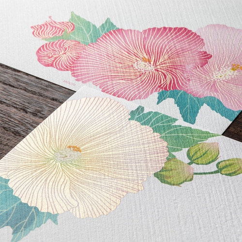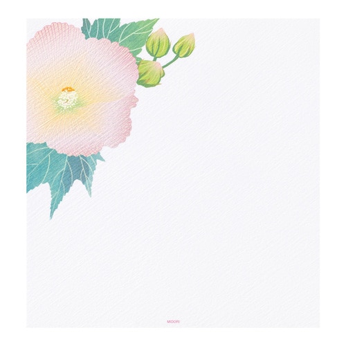 1000年もの時を重ねてきた伝統素材の和紙を用いて、四季折々の花々を大胆な構図でデザインした季節の便りです。 少ない文字数でも美しく完成される紙面デザインは「紙シリーズ」ならでは。 盛夏の鮮やかな柄をそろえました。 特有のハケ目がある風合いの良い伊予和紙(白)を使用しています。 朝、咲き始めの白色から夕方、ピンクへと花色が変化する様子が、お酒に酔っているようだと名付けられた「酔芙蓉」。 そんな不思議な花色を、角度によって色が変わり輝く偏光パールシルク印刷をのせて表現しました。 2柄各8枚、16枚入りです。 ※酔芙蓉(読み方:すいふよう) 商品名:ミドリ 便箋 シルク 酔芙蓉柄 81031006