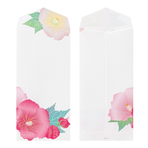 1000年もの時を重ねてきた伝統素材の和紙を用いて、四季折々の花々を大胆な構図でデザインした季節の便りです。 少ない文字数でも美しく完成される紙面デザインは「紙シリーズ」ならでは。 盛夏の鮮やかな柄をそろえました。 特有のハケ目がある風合いの良い伊予和紙(白)を使用しています。 朝、咲き始めの白色から夕方、ピンクへと花色が変化する様子が、お酒に酔っているようだと名付けられた「酔芙蓉」。 そんな不思議な花色を、角度によって色が変わり輝く偏光パールシルク印刷をのせて表現しました。 封筒は1柄6枚入りです。 商品名:ミドリ 封筒 シルク 酔芙蓉柄 81032006
