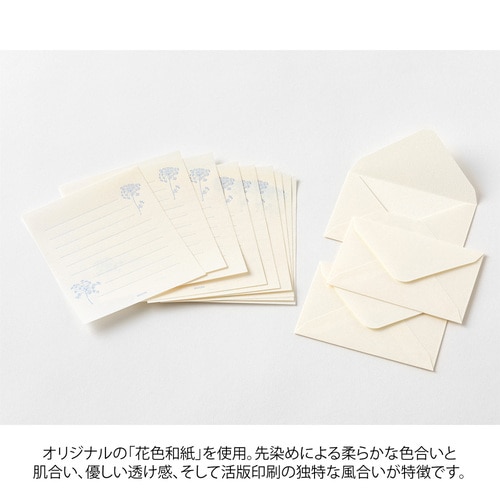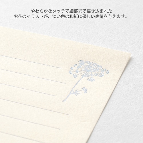 オリジナルで抄紙した先染めの越前和紙「DW花色和紙」で、ミニレターセットを作りました。 花が持つやわらかな色合いを大切に、思いを込めて作った和紙です。便箋は書き心地にこだわり、活版印刷で趣のある仕上げにしました。 自社工場の職人が一枚一枚丁寧に印刷しており、繊細な花の絵柄が引き立つデザインです。 A5サイズのレターセットだと文章で埋める自信がない、ボリュームが多すぎるという方や 試しに花色和紙のアイテムを使ってみたいという方のスターターアイテムとしてもおすすめです。 繊細な花の絵柄と和紙の色を生かした、ゆったりとしたレイアウト。 (白)レースフラワー :小さな花弁が集まり、雲のようにたなびく乳白色を和紙にうつしました。 商品名:ミドリ ミニレターセット花色和紙 白 86937006【検索ハッシュタグ】#デザインフィル#designphil#midori#かわいい#可愛い#おしゃれ#お洒落#おすすめ#シンプル#大人#レター#手紙#便箋#上品#結婚式#高級感#横書き#植物#花#活版#和紙#清楚#日本製#上質#ホワイト