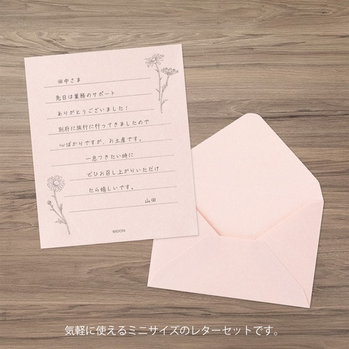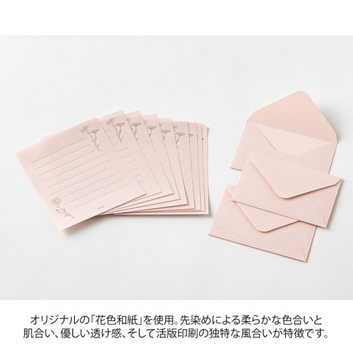 オリジナルで抄紙した先染めの越前和紙「DW花色和紙」で、ミニレターセットを作りました。 花が持つやわらかな色合いを大切に、思いを込めて作った和紙です。便箋は書き心地にこだわり、活版印刷で趣のある仕上げにしました。 自社工場の職人が一枚一枚丁寧に印刷しており、繊細な花の絵柄が引き立つデザインです。 A5サイズのレターセットだと文章で埋める自信がない、ボリュームが多すぎるという方や 試しに花色和紙のアイテムを使ってみたいという方のスターターアイテムとしてもおすすめです。 繊細な花の絵柄と和紙の色を生かした、ゆったりとしたレイアウト。 (ピンク)デイジー:陽の光に向かってゆったりと揺れる薄桃色を和紙にうつしました。 商品名:ミドリ ミニレターセット花色和紙 ピンク 86938006【検索ハッシュタグ】#デザインフィル#designphil#midori#かわいい#可愛い#おしゃれ#お洒落#おすすめ#シンプル#大人#レター#手紙#便箋#上品#結婚式#高級感#横書き#植物#花#活版#和紙#清楚#日本製#桃色