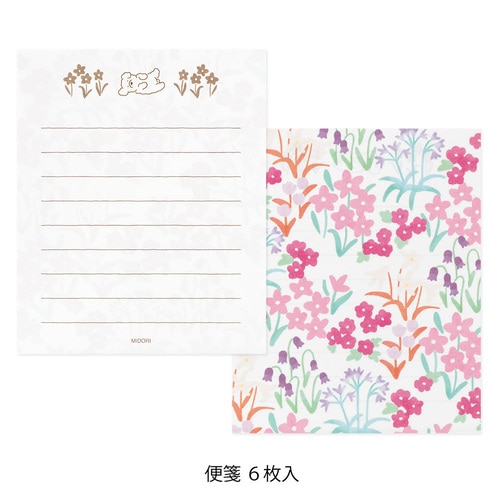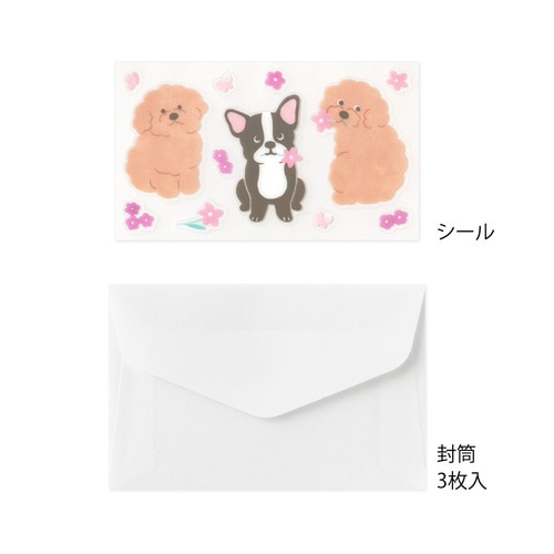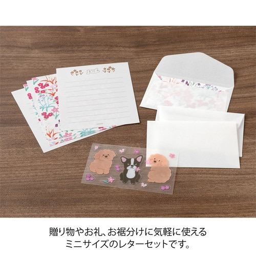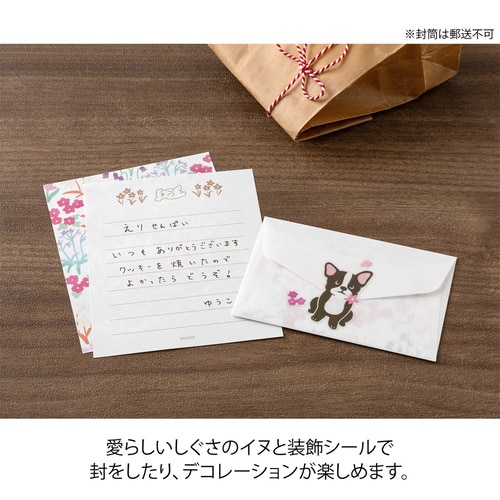 かわいい動物の贈り物シールで、封をしたり、デコレーションをしたりできるミニレターセットです。 封筒からうっすらと透ける便箋の裏面には優しい自然の風景が広がります。 そして、シールのモチーフの動物が、その風景から持って来たお花や木の実などをギフトとして、温かな気持ちと一緒に受け取り手に届ける、といったストーリーが隠れています。 さらに、ユニークな姿の動物やお花や木の実などのシールで封をしたり、デコレーションをしたりと、楽しい仕掛けが随所に施されています。 手紙を書く人も受け取る人も、くすっと笑顔になる、コミュニケーションのきっかけになるようなアイテムです。 「イヌ柄」 華やかなピンク系のお花が咲き乱れる、ハッピーな雰囲気の便箋のデザイン。 愛らしいしぐさのフレンチ・ブルドッグとプードルのシールに心が和みます。便箋の筆記面には、お花畑で遊ぶプードルの姿も。