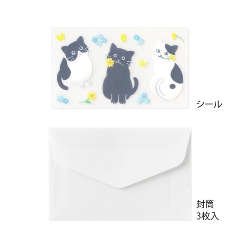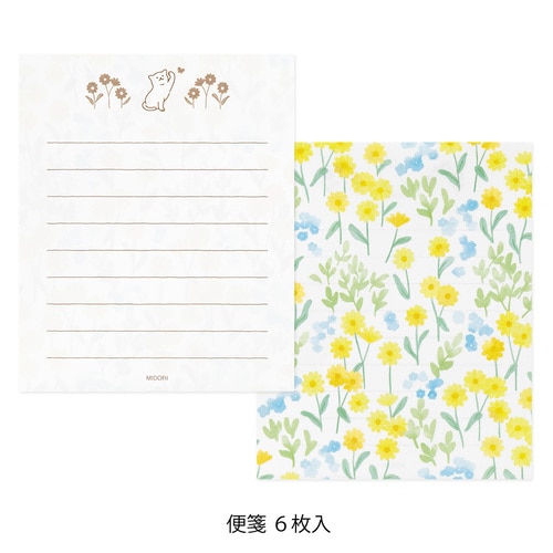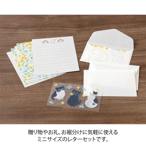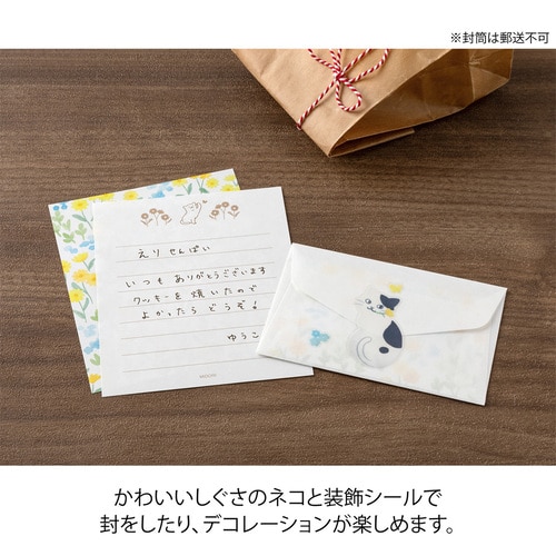 かわいい動物の贈り物シールで、封をしたり、デコレーションをしたりできるミニレターセットです。 封筒からうっすらと透ける便箋の裏面には優しい自然の風景が広がります。 そして、シールのモチーフの動物が、その風景から持って来たお花や木の実などをギフトとして、温かな気持ちと一緒に受け取り手に届ける、といったストーリーが隠れています。 さらに、ユニークな姿の動物やお花や木の実などのシールで封をしたり、デコレーションをしたりと、楽しい仕掛けが随所に施されています。 手紙を書く人も受け取る人も、くすっと笑顔になる、コミュニケーションのきっかけになるようなアイテムです。 「ネコ柄」 黄色と水色の花々が広がる、爽やかな風景の便箋のデザイン。 お花をくわえたり、上目遣いをしたりするネコのかわいいしぐさのシールに癒されます。便箋の筆記面には、お花畑で蝶々と遊ぶネコの姿も。