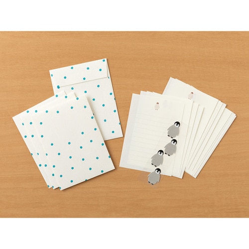 ふわっとした起毛素材の動物シールが付いたレターセットです。 便箋は一筆箋感覚で使える小ぶりなサイズ、封筒にはL判写真も入ります。 ちょっとしたお礼やお手紙を書きたいときにぴったりです。 *郵送可能 ペンギン柄:首をかしげたり、あどけない表情がわかいいペンギン柄のシール。封筒は、雪をイメージした水玉模様です。 ・親しい友人へ、近況を伝えるフレンドリーな手紙として。 ・一緒に働く仕事仲間へ、借りていた本を返却するときに感想を少し添えて。 ・遠方に住む親戚へ、旅のお土産に添える手紙として。