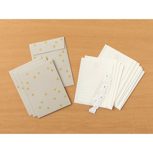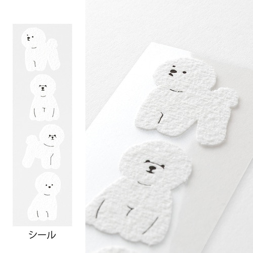 ふわっとした起毛素材の動物シールが付いたレターセットです。 便箋は一筆箋感覚で使える小ぶりなサイズ、封筒にはL判写真も入ります。 ちょっとしたお礼やお手紙を書きたいときにぴったりです。 *郵送可能 ビションフリーゼ柄:真っ白な毛並みと綿あめのようなふわふわとしたフォルムが特徴的な、ビションフリーゼ柄のシール。封筒の模様は、その軽やかな姿をイメージした風船です。 ・親しい友人へ、近況を伝えるフレンドリーな手紙として。 ・一緒に働く仕事仲間へ、借りていた本を返却するときに感想を少し添えて。 ・遠方に住む親戚へ、旅のお土産に添える手紙として。