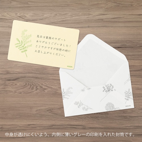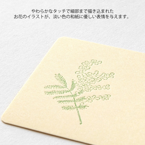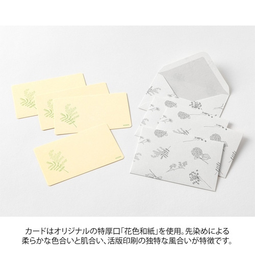 オリジナルで抄紙した先染めの越前和紙「DW花色和紙」で、ミニカードセットを作りました。 花が持つやわらかな色合いを大切に、思いを込めて作ったミニカードです。 ミニカードは書き心地にこだわり、活版印刷で趣のある仕上げにしました。 自社工場の職人が一枚一枚丁寧に印刷しており、繊細な花の絵柄が引き立つデザインです。 繊細な花の絵柄と和紙の色を生かした、ゆったりとしたレイアウト。 花が一輪添えられているようなデザインなので、一言書くだけで、すてきなメッセージギフトになります。 (黄)ミモザ:風に戯れて舞うような柔らかな黄色を和紙にうつしました。 商品名:ミドリ カードセット名刺サイズ 花色和紙 黄 88790006【検索ハッシュタグ】#デザインフィル#designphil#midori#かわいい#可愛い#おしゃれ#お洒落#おすすめ#シンプル#大人#レター#手紙#便箋#上品#結婚式#高級感#横書き#縦書き#植物#花#活版#和紙#日本製#上質#イエロー