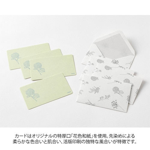 オリジナルで抄紙した先染めの越前和紙「DW花色和紙」で、ミニカードセットを作りました。 花が持つやわらかな色合いを大切に、思いを込めて作ったミニカードです。 ミニカードは書き心地にこだわり、活版印刷で趣のある仕上げにしました。 自社工場の職人が一枚一枚丁寧に印刷しており、繊細な花の絵柄が引き立つデザインです。 繊細な花の絵柄と和紙の色を生かした、ゆったりとしたレイアウト。 花が一輪添えられているようなデザインなので、一言書くだけで、すてきなメッセージギフトになります。 (緑)アナベル:優しくふんわりと揺らめく若葉色を和紙にうつしました。 商品名:ミドリ カードセット名刺サイズ 花色和紙 緑 88791006【検索ハッシュタグ】#デザインフィル#designphil#midori#かわいい#可愛い#おしゃれ#お洒落#おすすめ#シンプル#大人#レター#手紙#便箋#上品#結婚式#高級感#横書き#縦書き#植物#花#活版#和紙#日本製#上質#グリーン