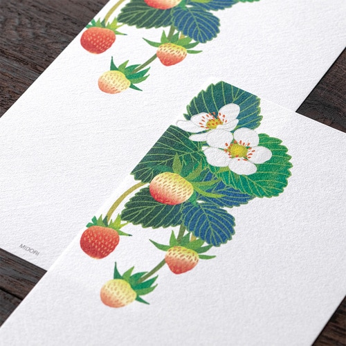 1000 年もの時を重ねてきた伝統素材の和紙を用いて、四季折々の花々を大胆な構図でデザインした季節の便りです 。 少ない文字数でも美しく完成される紙面デザインは「紙シリーズ」ならでは 。 特有のハケ目がある風合いの良い伊予和紙(白)を使用しています 。 2021年に発売し、人気の高かった箔苺柄を再発売します 。 パールシルク箔を施した苺の白い花と鮮やかな緑色の葉のコントラストが美しいデザインです 。 少ない文字でも様(読み方:さま)になるデザイン、和風に寄り過ぎない和モダンのデザインなので、メッセージカード感覚で活用いただけます 。 1柄16枚入りです 。 商品名:ミドリ 一筆箋 箔 苺柄 89600006【検索ハッシュタグ】#デザインフィル#designphil#midori#かわいい#可愛い#おしゃれ#オシャレ#おすすめ#シンプル#大人#無罫#花#手紙#お祝い#上品#季節#芸術#アート#紙シリーズ#春レター#和紙#便箋#封筒#植物#いちご