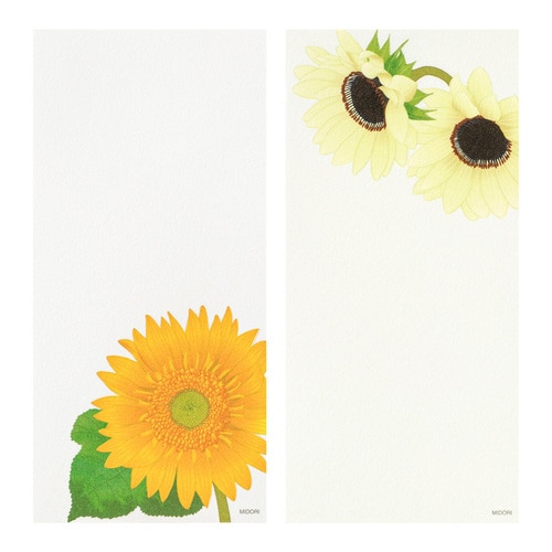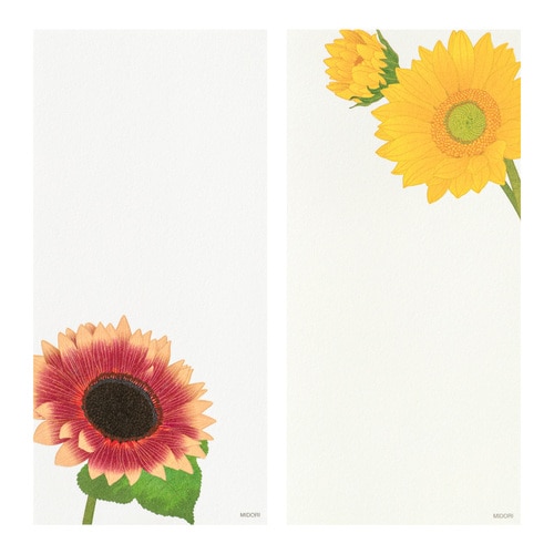 1000年もの時を重ねてきた伝統素材の和紙を用いて、四季折々の花々を大胆な構図でデザインした季節の便りです。 少ない文字数でも美しく完成される紙面デザインは「紙シリーズ」ならでは。 盛夏の鮮やかな柄をそろえました。 やさしい肌合いの越前和紙「越前鳥の子」(白)を使用しています。 夏の日差しの中、あざやかに咲く4種類のひまわりをアソート。 大きさや色など品種の異なるひまわりをアソートしました。 4柄各4枚、16枚入りです。 商品名:ミドリ 一筆箋 4柄入 ひまわり柄 89605006