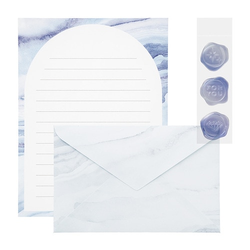 透明で立体的なシーリングワックス風シール付きの、鉱石をイメージしたレターセットです。ブルーレースアゲートのモチーフです。【検索ハッシュタグ】#レター#マルアイ#ミネラ#シーリング#ブルー