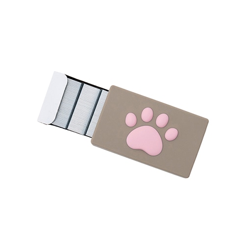 ねこをモチーフにしたシリコンカバーによるかわいらしいホッチキス3種と、肉球デザインのケース付き針2種がそれぞれ3個ずつ入った什器付きセットです。