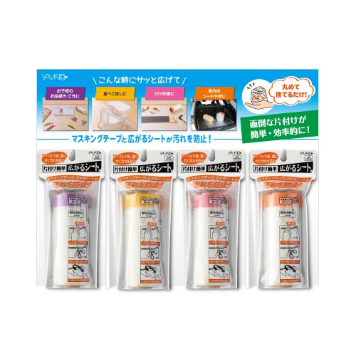 ・マスキングテープと折りたたまれた養生シートが一体になった商品。テーブルや床などに敷くことで汚れを防ぐ。使用後は丸めて捨てるだけで片付けが簡単・効率的に済ませられる・家庭、外出時などいろいろな用途に使えて便利・日常で使いやすい粘着力、サイズを選定・シートの表面処理によりひらひらせず床などに吸着し使いやすい(風などで捲れる場合は仮止めテープで端を留める) 【検索ハッシュタグ】#片付け#簡単#マスカー#掃除#シート#マスキング#テープ#汚れ#防止#防ぐ#お絵描き#クレヨン#グラスデコ#カラリックス#食べこぼし#DIY#防災#ヤマト