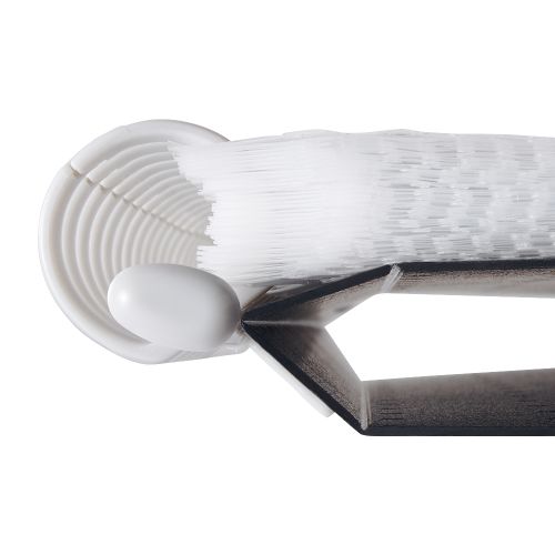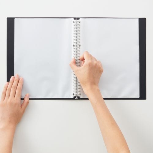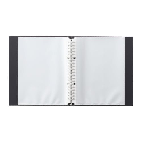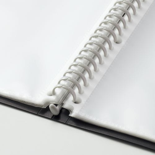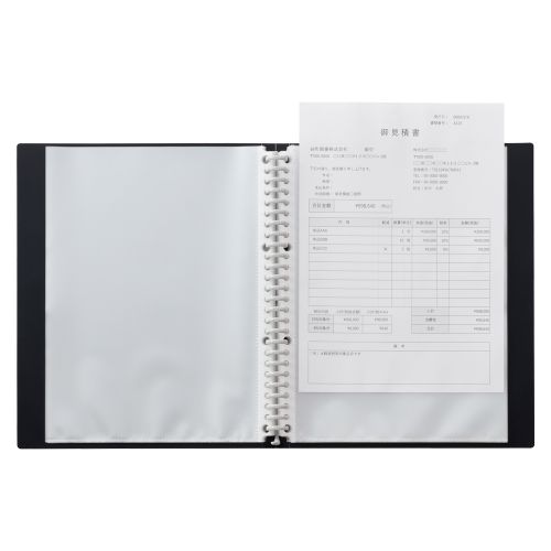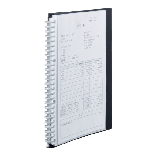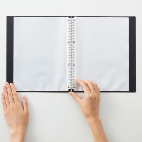 とじ具下部のボタンを押すと簡単にとじ具が開きます。順番にリングをつまんで閉じられます。背表紙が付いているのに360°折り返して使えます。