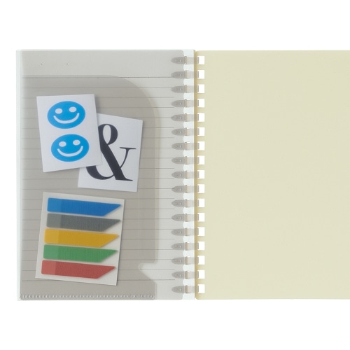 やわらかくて薄いリングは筆記時に手に当たっても気になりにくく、かさばらないので持ち運びに便利です。リングと一体になったオープンポケット付きで、ふせんやシール、カードなどを入れて一緒に持ち運びができます。使い終わったノートのリングをハサミで切ってリーフを取り外し、オープンリングノートやツイストノートにとじることができます。【検索ハッシュタグ】#ソフトリング#ノート#リヒトラブ#使いやすい#新色