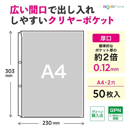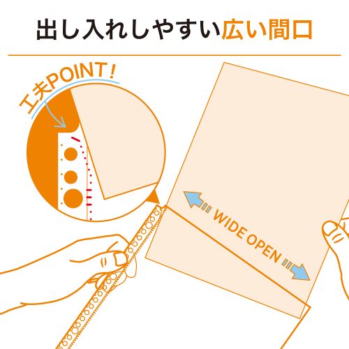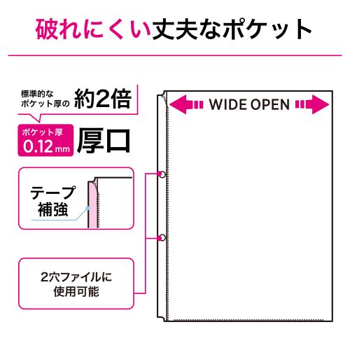 A4・30穴、生地厚0.12mmのトップインタイプのクリヤーポケットです。開口部が広く、用紙の出し入れがスムーズに行えます。通常のクリヤーポケットの2倍の厚さで耐久性に優れ、大事な書類の収納に最適です。とじ穴部はテープで補強されているので、丈夫でいたみにくく、長期間ご使用いただけます。
