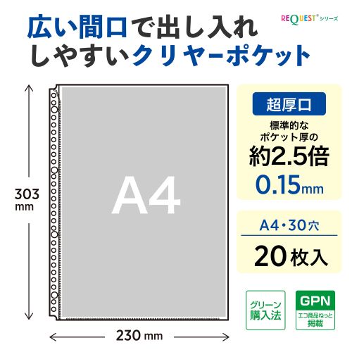 A4・2穴、生地厚0.12mmのトップインタイプのクリヤーポケットです。開口部が広く、用紙の出し入れがスムーズに行えます。通常のクリヤーポケットの2倍の厚さで耐久性に優れ、大事な書類の収納に最適です。とじ穴部はテープで補強されているので、丈夫でいたみにくく、長期間ご使用いただけます。