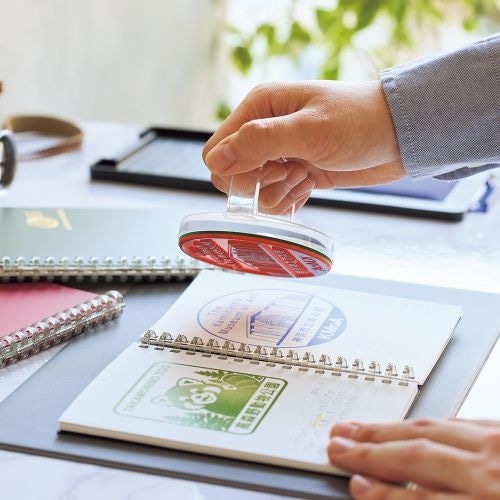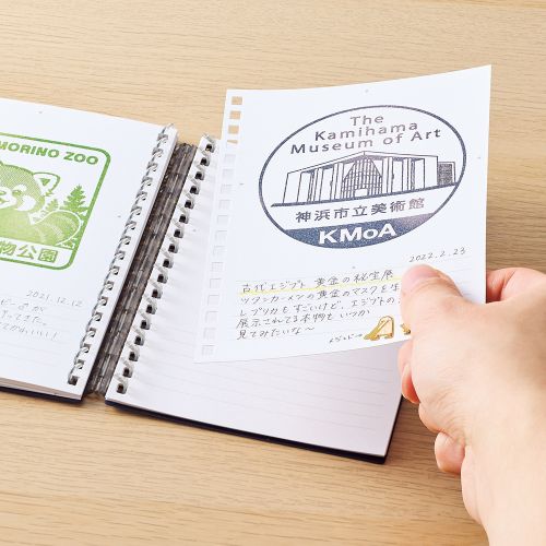 リングを開いてリーフの追加・交換ができます。リーフを取り出して、捺印マットの上できれいにスタンプが押せます。扉紙でスタンプを押したリーフを挟むことでインク移りを防ぐことができます。リーフにはスタンプを押す位置がわかりやすいガイド付き。スタンプ押印スペースの下には旅の思い出などをメモ書きできます。別売りの無地や方眼罫などのリーフを組み合わせることでカスタムできます。