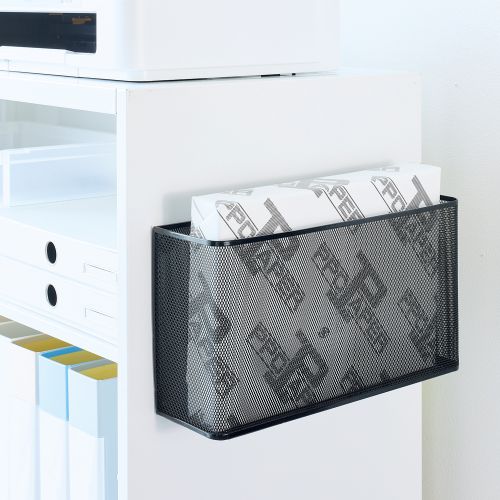 A4コピー用紙500枚収納可能。エキスパンドメタル素材を使用し、とても軽量。デスクサイドに最適。強力なネオジム磁石を使用。接触部分保護用のゴム付き。(目安保持荷重3kg)