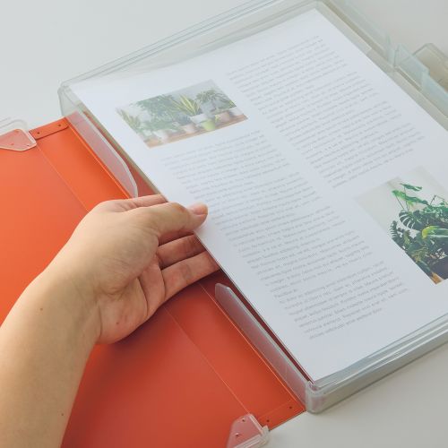 180°フルオープンでA4書類や小物をまとめて収納できる。