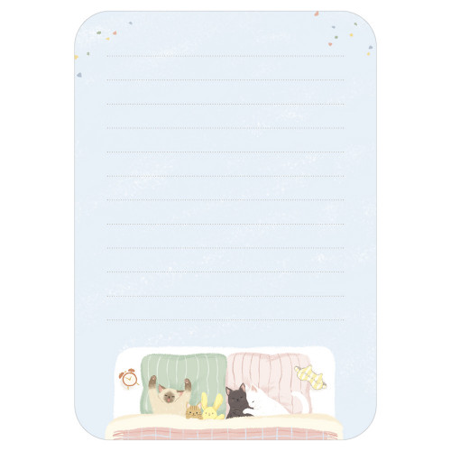 にゃんとも にゃんとも自由な、ねことともだち。 仲良しの猫たちが戯れる姿がかわいいレターです。 お部屋で自由に眠るシーンを描きました。 2柄アソートの便箋で気分に合わせて楽しめます。 便箋:182×128mm 封筒:95×140mm 登場する猫 ノア(黒猫): 丸まっていると「ブラックホール?」と言われる カール(ラグドール): 最近ごめん寝が板についてきた ブラン(白猫): ノアにくっつきがち 寝言が多い ベル(茶トラ猫): 寝るときはうさぎのぬいぐるみといつも一緒