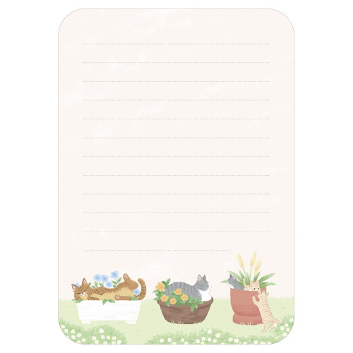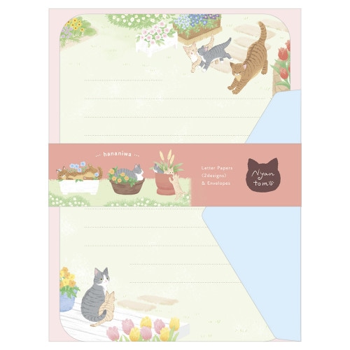 にゃんとも にゃんとも自由な、ねことともだち。 仲良しの猫たちが戯れる姿がかわいいレターです。 花咲く庭で自由に遊んでいるシーンを描きました。 2柄アソートの便箋で気分に合わせて楽しめます。便箋:182×128mm 封筒:95×140mm登場する猫 さくら(サバトラ猫): 植木鉢の心地よさを覚えてしまった困ったさんうめ(キジトラ猫): 子猫達の姉的存在 花びらをつつくことが好きつくし(クリーム猫)、すみれ(サバトラ猫)、あんず(クリーム猫): さくらの子どもたち なんにでも興味を示すお年頃