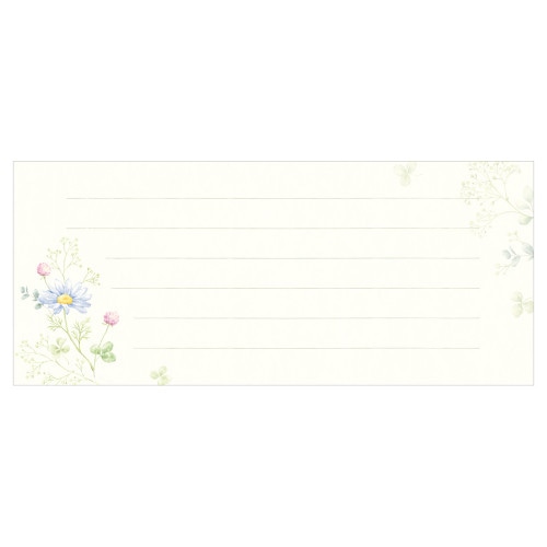 佳乃 -よしの- 通年お使いいただける、上品な2柄アソートの一筆箋です。 クローバーやデイジー、かすみ草など身近な花々を柔らかいタッチで描きました。 落ち着きのある和紙の風合いと楚々とした花のデザインで、ご挨拶やお礼、お見舞い、目上の方へのお手紙など幅広くお使いいただけます。