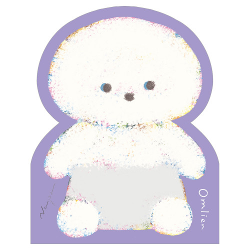Omlien 可愛くインパクト充分なダイカットメモ。 ちょこっとひとこと書きたい時に便利なサイズです。 Omlien(おむりあん)とは、惑星OM(おーえむ)からやってきた、おむつをはいたエイリアン。 ビションフリーゼのようなキャラクター「なぱ」:のんびりマイペース。何もないところを見つめながら、哲学的なことを考えている。おむつはLサイズ。