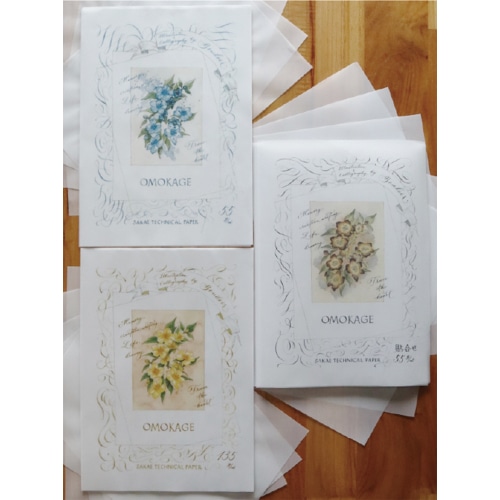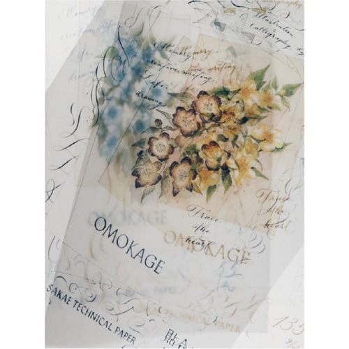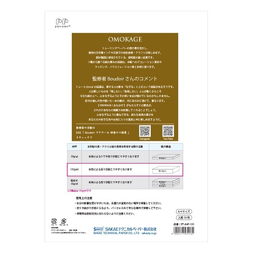 カリグラフィー・クラフト用トレーシングペーパー「OMOKAGE」の中で中間の厚さのトレーシング135g/m2です。万年筆インクや文具での色彩表現・クラフトが楽しめます。
